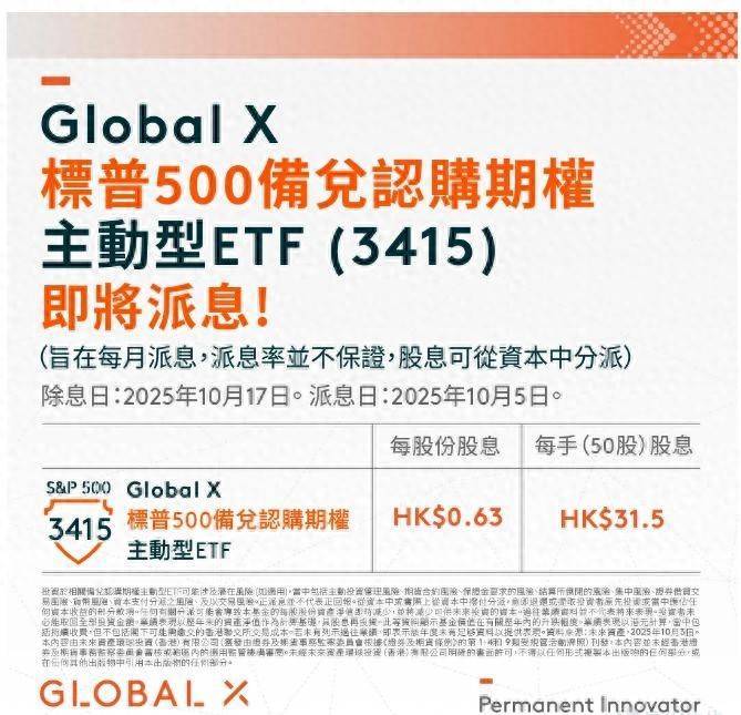 智通财经APP获悉,为满足投资者对收益和抵御市场波动的需求,Global X ETFs于2025年9月30日在香港交易所推出了Global X 标普500备兑认购期权主动型ETF(03415) 。这支ETF目标是按月派发股息(派息率并不保证,股息可从资本中分派),为投资者提供相对稳定的收益机会。此ETF即将派息,每股份股息0.63港元,每手(50股)股息为31.5港元,除息日为2025年10月17日,派息日为2025年10月24日。